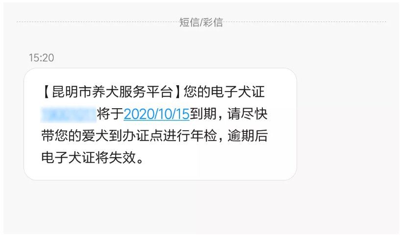 已辦理電子犬證(自登記日期起,有效期為12個月),當電子犬證有效期不足1個月時,平臺會發(fā)送短信提示犬主。
