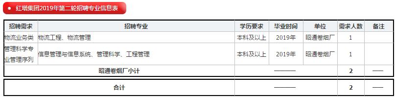 結(jié)合紅塔集團(tuán)昭通卷煙廠專(zhuān)業(yè)結(jié)構(gòu)及人員需求情況,現(xiàn)計(jì)劃新增招聘2人,具體招聘需求、專(zhuān)業(yè)、名額及相關(guān)條件詳見(jiàn)招聘專(zhuān)業(yè)信息表(見(jiàn)下)。