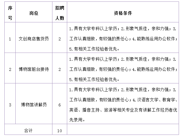 本次共招聘10名。其中,文創(chuàng)商店售貨員2名,博物館前臺接待2名,博物館講解員6名。應(yīng)聘人員在符合招聘基本條件基礎(chǔ)上,需符合以下相關(guān)崗位資格條件。具體崗位條件如下: